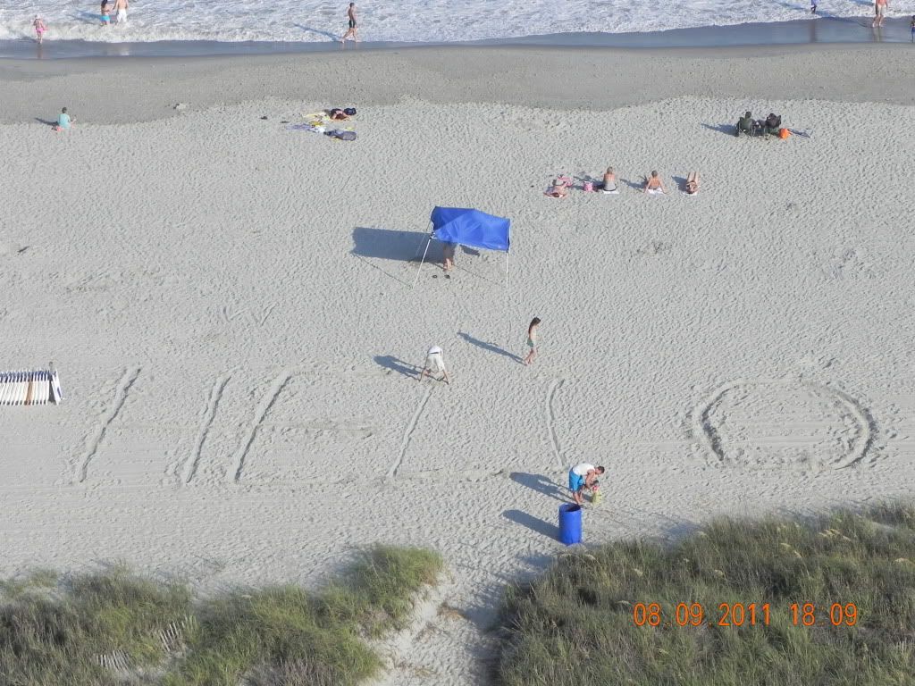 This is one of the places I went to on vacation. And lookit that, the beachgoers even left everyone a nice welcoming message! I took this picture on the 12th floor balcony of my hotel room.