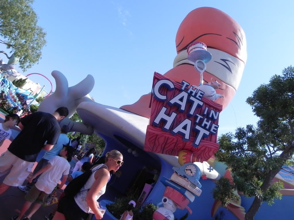 And the first ride we rode? That Cat in the Hat ride. Now you’d think this is a kid’s ride, right?Well it’s not D: This ride was scary as fuuuuuudge. The Cat in the Hat in this ride, I swear to goodness gracious, had like evil black eyes with no friggin pupils that seemed to stare into your very soul and there was one part where you start spinning around and around while you’re strapped into your seat and surrounded by some trippy seizure-inducing background.