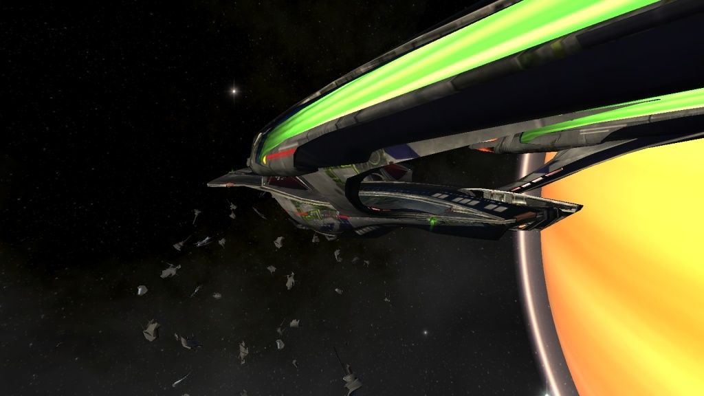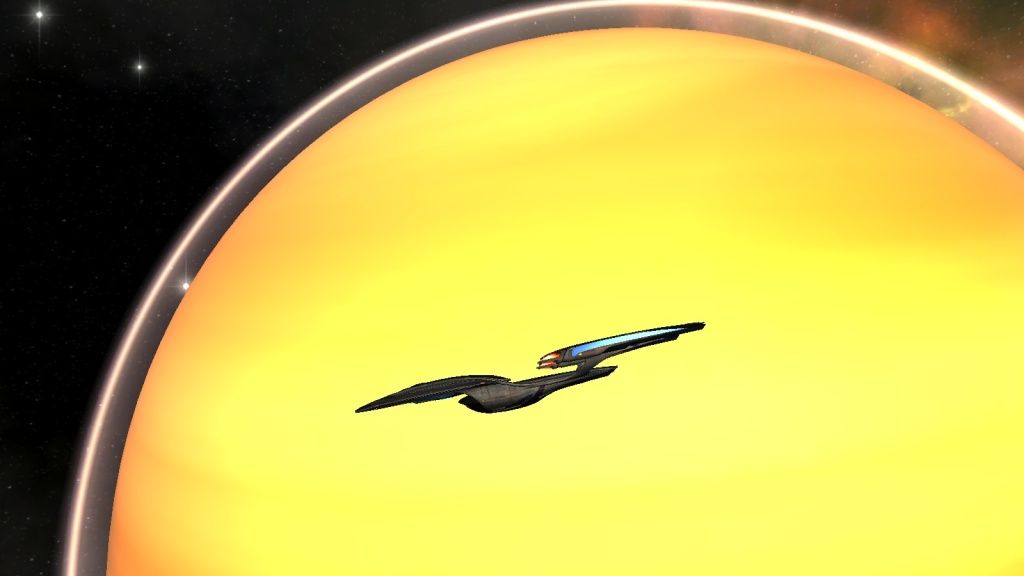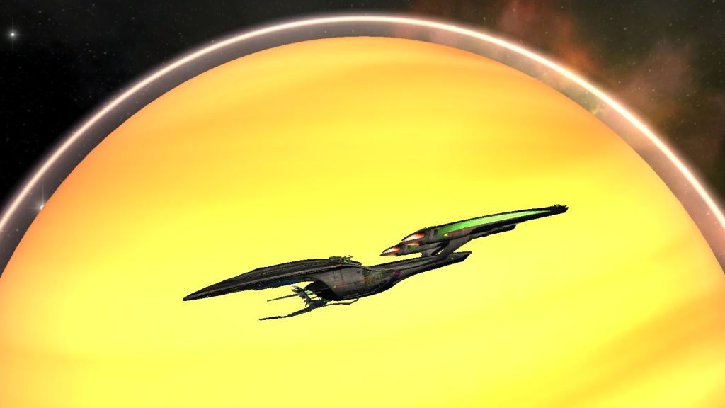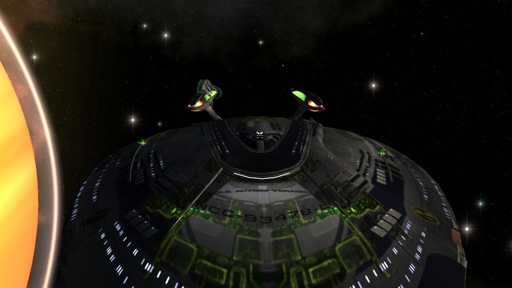 This design of the ship has been named as the Odyssey-Class cruiser. For anyone who knows MMOs and online games, it's a tank. Essentially, it's stats are based on the premise of "Sit there, move little, and deal a LOT of damage while also taking a severe beating in return." However, I would be Kairu if I followed the stereotypes. I've built up mine to be more evasive and less tanking. Now the following pics are the screecaps I've taken in-game so you can see how cool this ship really is. The first set is the normal "vanilla" design. The second set is the a Borg set which essentially "borgifies" your ship. So without further ado, say 'Hello' to my main ship, the Rhykim Verass-E (Yes, I did name it that). I also have a whole album in which I will try to keep up with that has/will contain other screenshots I take in-game. Here's the link: http://s240.photobucket.com/albums/f...%20Screencaps/